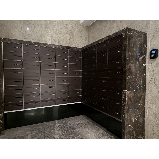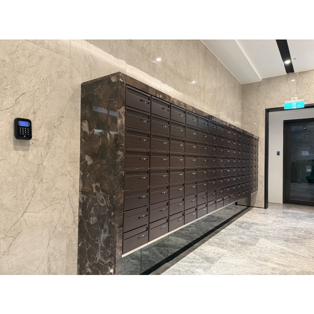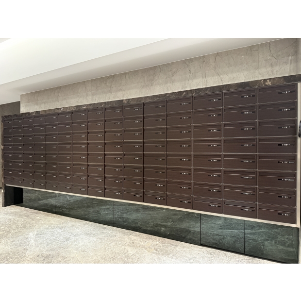 單個規格:W300*H150*D400mm 箱體材質:sus#304 0.6t 霧面 門扇材質:secc 1.0t 鍍鋅鋼板 (鐵刀木木紋) 門牌材質:壓克力 (黑底白字) **單元組合式信箱** **依現況規劃信箱排列**